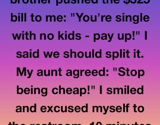 At a restaurant, my brother pushed the $325 bill to me: “You’re single with no kids – pay up!” I said we should split it. My aunt agreed: “Stop being cheap!” I smiled and excused myself to the restroom. 10 minutes later, I handed them a small white envelope.