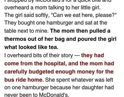 They sat at the table next to mine. The girl’s excitement was palpable as her mother unwrapped the hamburger and split it in half, handing the larger piece to her daughter. The mom then reached into her bag and pulled out a small thermos, pouring what looked like tea into a plastic cup she had brought from home. Read more below