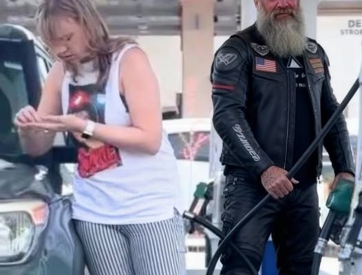 The biker started pumping gas into the crying girl’s car. And he changed her entire life. Sometimes heroism looks like that. Small. Simple. Just filling up someone’s tank and asking if they’re okay.