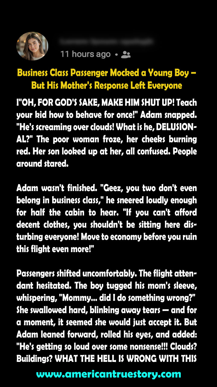 We were on a transcontinental flight, one of those long ones where people either read, sleep, or silently curse the crying babies in the back. Adam, of course, was in business class. Always was. He didn’t just expect comfort, he demanded it — peace, silence, and a stiff drink.