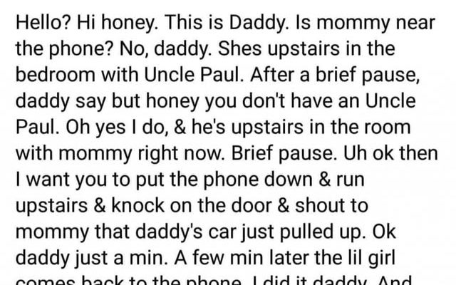 “Well,” Emma said after a small pause, “Mommy got really scared. She said a bad word and told Uncle Paul to run. Then they both ran out the back door really fast.”