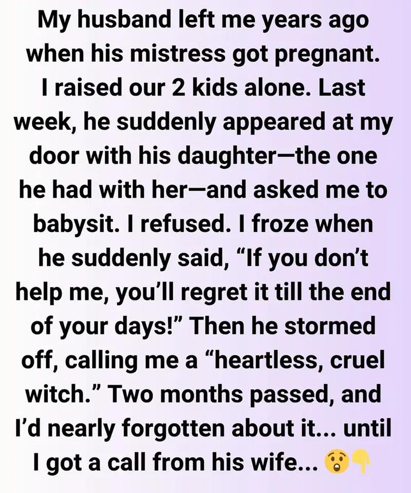 Years ago, my husband left me when his mistress became pregnant. I raised our two children on my own. Then, last week, he unexpectedly showed up at my door with his daughter—the one he had with her—and asked me to babysit.