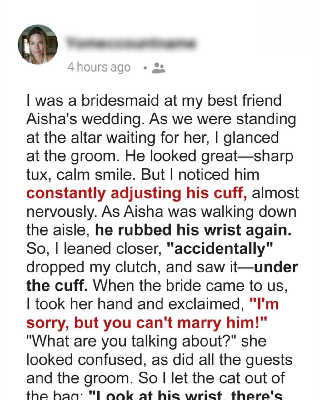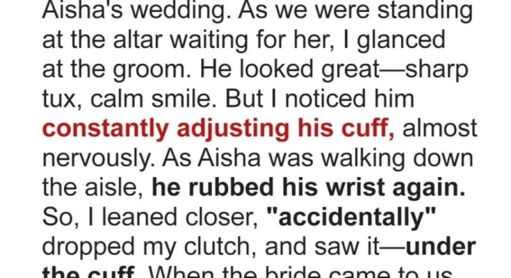 Everything was picture-perfect at my best friend Aisha’s wedding. The music was soft, the flowers perfect, and Aisha—glowing in her lace gown—walked down the aisle like a dream. But just as she reached the altar, something subtle caught my eye. Jason, her groom, was rubbing his wrist—over and over, like he was trying to hide something. It was a nervous gesture, one I’d seen before. As he adjusted his cuff, I caught a glimpse of what he was trying to conceal: a name tattooed on his skin. Not Aisha—but Cleo. My heart skipped. Cleo was someone from his past. A name he once swore meant nothing.