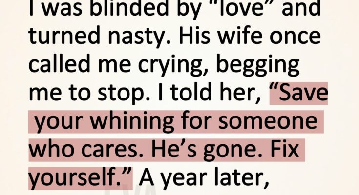 At the time, I called it love. I told myself that passion justified cruelty, that desire excused betrayal. I became someone I didn’t recognize—sharp-tongued, selfish, and vicious. His wife once called me, her voice trembling through the phone, begging me to stop. She cried, pleaded, asked me to give her family back. And I, drunk on arrogance, spat venom into her wounds. “Save your whining for someone who cares,” I told her coldly. “He’s gone. Fix yourself.” That was me. That was the person I became.