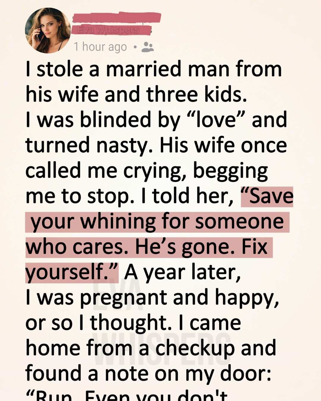 I stole a married man. Not just a husband, but a father of three. A man who had built a life with someone else, who had promises carved into the walls of his home, who had children who looked up at him with trust in their eyes. And I tore it all apart.