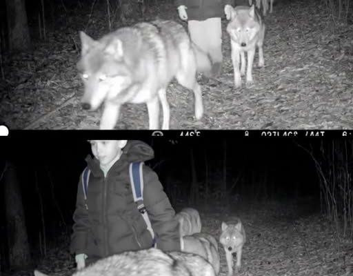 The boy emerged from the wild, stepping onto an old trail near the forest’s edge, dirty but safe. All worry melted away in the mother’s tearful embrace. “How did you find your way back?” she asked. The boy answered quietly: “The wolves showed me.” Most doubted his tale, believing it was a child’s comfort after a terrifying night. Yet a local hunter’s camera soon revealed something astonishing—a video of the boy calmly walking between two wolves, one ahead, one behind.