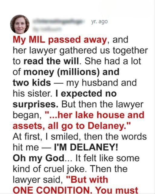I stood up from my chair, feeling the walls close in on me. This was too much. My mother-in-law had always made me feel like I wasn’t part of the family, yet she’d left me everything. And then there was this condition — a year of isolation. The idea sounded like a punishment, not a gift.