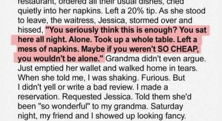 I told her about the anniversary. About the outfit my grandmother wore. About the twenty percent tip she left — all she could afford. About the long walk home in tears.
