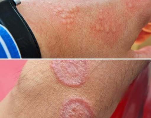- Red, raised, or swollen bumps that appear and disappear repeatedly